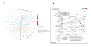 Figure 3: Identification of Key Genes and Key KEGG Biological Pathways Associated with out Top 40 DEGs. (A) KEGG CNET plot, (B) KEGG Mineral Absorption Pathway. (A) The KEGG CNET plot illustrates the relationships between enriched pathways and genes in the dataset. Each circle represents either a gene or a KEGG pathway, with colored edges indicating gene-pathway associations. Different colors correspond to distinct pathways, highlighting the multi-pathway involvement of specific genes and the functional connectivity within the biological system. (B) The KEGG map highlights enriched KEGG pathways among the DEGs, with the Mineral Absorption being most significantly overrepresented. The plot shows pathway significance based on adjusted p-values.