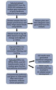 The selected DEGs were further analyzed using SRPlot, KEGG, and Gene Ontology (GO) bioinformatics tools. SRPlot provided graphical tools for visualizing gene expression patterns. KEGG was used to investigate relevant signaling pathways and molecular interactions potentially involved in early tumorigenesis. GO analysis classified the genes into functional categories based on biological processes, molecular functions, and cellular components. Together, these tools provided insight into the potential biological roles and pathways involved in the earliest stages of colorectal cancer development in Lynch Syndrome.
