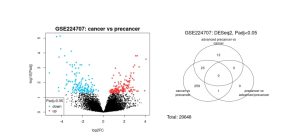 Figure 2. Differentially Expressed Genes (A) Volcano Plot, (B) Venn Diagram illustrates gene expression differences across disease progression stages based on data from GSE224707. (A) Genes with substantial upregulation or downregulation in cancer versus precancer (based on log2 fold change thresholds) are shown in red and blue, respectively. Black dots indicate genes with minimal or no expression change. (B) The Venn diagram summarizes differentially expressed genes (DEGs) identified in each pairwise comparison. From 20,648 genes analyzed, 296 were found to be differentially expressed based on log2FC cutoffs, with very limited overlap among the conditions.