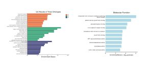 Figure 3. (a) GO Pathway Enrichment Bar Graph Across Ontologies, (b) Bar Plot of Molecular Function Enrichment. (a) Enrichment score bar plot illustrating top GO terms across biological processes (BP), cellular component (CC), and molecular function (MF) categories. Terms such as “collagen fibril organization” and “immunoglobulin complex” are enriched, reflecting structural remodeling and increased immune activity during lesion transition. (b) MF terms ranked by enrichment score and statistical significance.