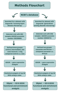 NCBI’s bioinformatics tool, GEO2R was used to analyze two datasets, one for coronary heart disease (GSE20686) and one for generalized anxiety disorder (GSE61672). I then downloaded the full table to find the top 30 differentially expressed genes using p-value. I then used SRplot to further analyze the gene samples using GO and KEGG analysis.
