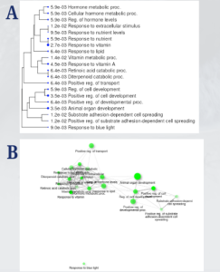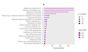 The GO analysis identified key pathways, including the Retinoic Acid Catabolic Process and Diterpenoid Catabolic Process, both with the highest fold enrichment of 183, as well as the Response to Blue Light (152.5) and Response to Vitamin A (72.3) Figure 4B. These pathways highlight retinoid metabolism, vitamin regulation, and light-responsive mechanisms Figure 4A. Additionally, pathways such as Positive Regulation of Cell Development (10.1) and Substrate Adhesion-Dependent Cell Spreading (16.1) highlight processes crucial to cellular growth and adhesion Figure 4B.
