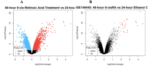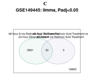 A total of 22,576 DEGs were identified, including 3,681 downregulated genes and 30 shared genes between the two treatment comparisons. Additionally, 3 upregulated genes were unique to the 48-hour 9-cisRA vs. 24-hour 9-cisRA treatment comparison, while 18,865 genes were unique to the 24-hour ATRA vs. 24-hour Ethanol Control comparison. Enrichment analysis revealed pathways like retinoic acid catabolic process, vitamin A metabolism, and immune system regulation. The main DEGs are CYP26A1, CYP26B1, LRAT, SPP1, FOXF2, and RARB, which relate to retinoid metabolism and pathways of cell adhesion and differentiation.