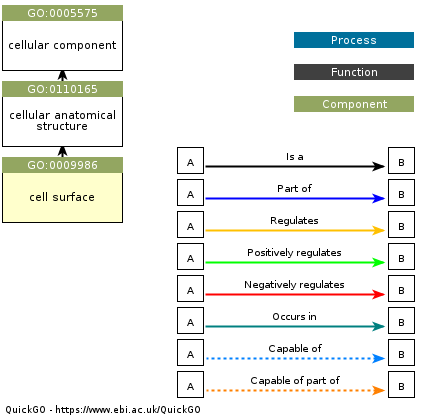 Figure 4: Significant gene ontology term: Cell surface, the outer part of the plasma membrane for brain cells. Its structure is connected to expression of genes in this pathway. The black lines mean that something is the next thing.