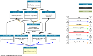Figure 3: Significant gene ontology term: signal transduction, where signals are converted into cellular change or processes and it can be influenced by gene expression as shown in the pathway. Black lines mean something is the next thing, blue means something is part of the next thing, and yellow means it regulates the next thing.