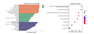 Figure 4A and B: a) BP, CC, and MF are the three ontologies that are pictured in this graph. The graph reveals that the top 30 DEGS are most enriched in BP and MF. Overall, the enrichment scores were greater than or around 1.5. b) Dot plot illustrating the enrichment score and p-value for various molecular functions. The plot shows that genes involved in oxidoreductase activity, G-protein beta-subunit binding, and neuropeptide hormone activity are among the most significantly enriched functions. The color and size of the dots correspond to the p-value and the number of genes associated with each term, respectively.