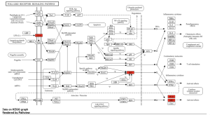 Figure 4: Second Key Pathway identified to be associated with the top 50 DEGs Toll-Like Receptor Signaling Pathway with key genes highlighted in red; CD14, IRF7, IP-10, and MIG