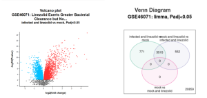 Figure 2: A and B: Data from GEO2R results A. volcano plot and B. venn diagram. In the volcano plot Red dots mean highly expressed or up-regulated. Blue dots means less express or down-regulated. And black dots mean they’re no differences between the 2 groups. Most were highly expressive, but there was still a good amount of less expressive genes. In the venn diagram, there are a total of 20859 genes. 771 of the genes are in infected and linezolid vs mock, 552 genes are in mock and linezolid vs infected and linezolid, and 3515 genes overlapped in both.