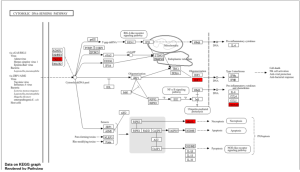 The next bioinformatics tool used was the Kyoto Encyclopedia of Genes and Genomes (KEGG). KEGG is a database that helps to understand the basic principles, as well as practical utilities, of the relations between gene and genomic information and higher order functional information of genes (7). In this study, KEGG was used to determine the potential functions of the identified significant genes from the GEO bioinformatics.