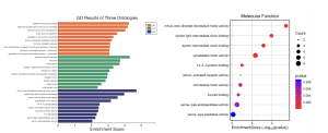 Figure 3: Gene Ontology Enrichment Analysis of DEGs- This figure presents GO enrichment results for differentially expressed genes across three ontologies. Bar plots show top enriched Biological Processes (BP), Cellular Components (CC), and Molecular Functions (MF), including peptide hormone processing, signaling receptor activity, and cell–cell adhesion. The dot plot highlights enriched molecular functions, including microtubule motor activity, dynein complex binding, and serine-type peptidase activity. Dot size indicates gene count; color represents p-value significance.