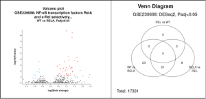For the GEO2R analysis of this dataset, the 10 samples were separated into 3 groups: RELA, REL, and WT. The RelA group consisted of 3 samples, the REL group consisted of 3 samples, and the WT group consisted of 4 samples. Once the groups were defined, GEO2R analysis was performed to identify the differentially expressed genes (DEGs) and generate a variety of graphs depicting gene expression. The programming language used for the GEO2R analysis can be found in the R script (R script). From the analysis results, the Volcano Plot, Venn Diagram, and DEGs were utilized in this study. The DEGs generated from the GEO2R analysis all had a p-value less than 0.05.