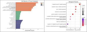 Figure 4. GO Analysis: A. The Go Results of Three Ontologies bar graph displays three ontologies and their enrichment within the genes analyzed. Orange represents Biological Processes (BP), green represents Cellular Components (CC), and blue represents Molecular Functions (MF). The BP ontology is significantly more enriched than CC and MF. The most enriched result in BP was the I-kappaB kinase (IKK) pathway.  B. The Biological Processes dot plot shows the enrichment score, p-value, and count for each biological process. The top biological process identified is the I-kappaB kinase (IKK) pathway.