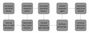 GEO2R (www.ncbi.nlm.nih.gov/geo/geo2r/) is an online tool designed for comparing and analyzing gene expression across different sample groups. It shows data as visual data charts Accessed the NCBI library. I used the GEO database to search for cystic fibrosis microarray data. I identified a dataset from research on cystic fibrosis that found that CFTR deficiency in cystic fibrosis disrupts lipid metabolism, promotes chronic oxidative stress, and drives a persistent pro-inflammatory state in airway epithelial cells. I then processed this GEO dataset for my study.