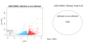 To process the datasets, I first defined or categorized the data into two groups; affected patients and non-affected patients, and then utilized the no-code GEO2R ‘Analyze’ tool, which operates with pre-programmed R scripts. Analysis with this tool generated multiple graphs of gene expression results which we analyzed. Using the volcano plot, I examined gene expression differences between the various sample groups. From the Venn diagram results, I evaluated the number of expressed genes and identified overlapping genes among the different human sample groups.