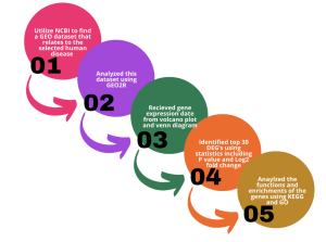 The main goal of this research was to identify significant genes that could be used as potential targets for a cure or effective treatment. Results from the analyses conducted in GEO2R and SR plots helped to define key genes that showed high enrichment and were involved in prevalent pathways.