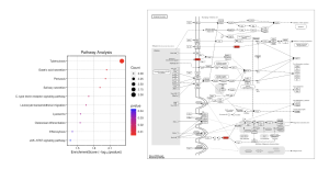 Figure 3: Functional Analysis from KEGG: The KEGG Pathway analysis results indicate the biological pathways that are significantly enriched within a set of genes. In this case, Tuberculosis is extremely prominent. In the Tuberculosis Pathway, the significant genes within the pathway are highlighted in red. These genes include Dectin-1, CALM, and CathepsinS.