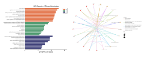 From the GO results of the Three Ontologies, the bar graph shows three ontologies and how enriched they are. The blue represents Molecular Functions (MF), the green represents Cellular Components (CC), and the orange represents Biological processes (BP). In this display, BP is slightly more enriched than the other two ontologies. The most significantly enriched BP was ‘import into cell.’ The cnet plot provided is used to visualize the relationship between genes and their associated pathways.